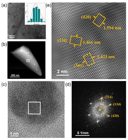 (a) TEM image of YABS glass, single nanocrystals are marked with white ellipses, the inset shows the particle size statistics of nanocrystals; (b) Transmission electron dark-field imaging of YABS glass; (c) Local enlargement of the white frame area in (b); (d) Fast Fourier Transform (FFT) of the white frame area in (c); (e) Lattice fringe image filtered by inverse Fourier transform (IFFT) of crystal diffraction pattern.