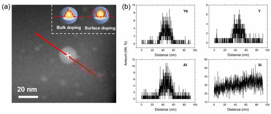 (a) Illustration of a typical line-scan for a single nanocrystal. The red line shows the cross-section used for the EDX chemical analysis. A point 50 nm from the beginning of the line is marked with a white cross. The inset shows the ideal distribution curves of bulk and surface doping of REs in nanocrystals. (b) Linear profile of the chemical composition, i.e., the amount of Yb, Al, Y, and Si in wt.%.