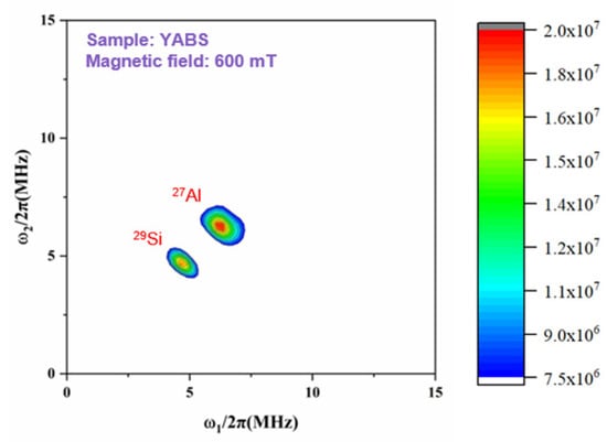 Ultra-low temperature EPR has been widely used to study the electron Zeeman splitting in the external magnetic field of the electron magnetic moment and the resonance jumps between energy levels caused by their interaction with the electromagnetic field [46]. The 2D-HYSCORE spectrum can accurately describe the average coordination environment of Yb3+ because of the hyperfine coupling between the unpaired electrons of Yb3+ and the nonzero nuclear spins of the surrounding nuclei. Figure 6 shows the 2D-HYSCORE spectra of the YABS glass; the Si and Al atom signals were detected in the next-nearest neighbors of Yb3+, while Y atoms were not detected because of their non-paramagnetic character. The presence of an Si signal indicated that a portion of Yb3+ ions were in the GP, while the presence of an Al signal indicated that a portion of Yb3+ ions may have been in the GP or in the nanocrystals. The information obtained by EPR (4K, 2D-HYSCORE) coincided with the results of the XRD, Raman spectroscopy, and TEM (HR-TEM, EDS); the nanocrystals were homogeneously dispersed in the silica glass with most of the REs retained in the GP, although a small fraction entered the interior of the nanocrystals. The small amount of REs entering the interior of nanocrystals do not cause additional crystal field effects on Yb3+, and the spectral pattern of Yb3+ remained in the GP. However, the spectral properties of Yb3+ were greatly enhanced by the presence of Yb:YAG, as discussed in detail.