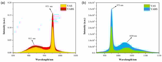 The absorption and emission spectra of the YAS and YABS glass are plotted in Figure 7. It has been established that the crystal field effect results in the splitting of the absorption and emission peaks if the REs are located inside the crystal. There was no change in the line shape of the absorption and emission peaks in Figure 7, thus confirming that the RE ions were mostly inside the GP [38]. Through the detailed characterization of the glass structure in this study, we confirmed that the YABS glass contained a small amount of Yb:YAG nanocrystals, while the YAS glass that was used as a comparison glass was a pure GP. Figure 7 clearly shows that the absorption and emission spectra of the YAS glass are significantly lower than YABS glass, which was mainly attributed to the small amount of Yb:YAG nanocrystals contained in the YABS glass as opposed to the YAS glass, which did not contain similar nanocrystals. Moreover, the small amount of Yb:YAG present in the YABS glass was insufficient to prevent most of the Yb3+ ions from being in the GP [38,43]. Therefore, YABS glass was significantly better than YAS glass in spectral intensity (absorption and emission spectra), while the spectral pattern of the Yb3+ ions in the GP was not significantly affected. A similar phenomenon was previously reported [35,43].