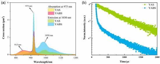 (a) Absorption and emission cross-sections and (b) Fluorescence lifetime decay curves of Yb3+ ions in the YAS and YABS glass (λex = 980 nm, λem = 1030 nm).