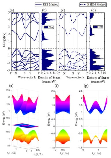 (a,c) The band structure of the monolayer β-AuSe using the PBE method and HSE06 method, respectively. (b,d) The density of states of the monolayer β-AuSe using the PBE method and HSE06 method, respectively. (e–g) The 3D band structure for the monolayer β-AuSe in different views.