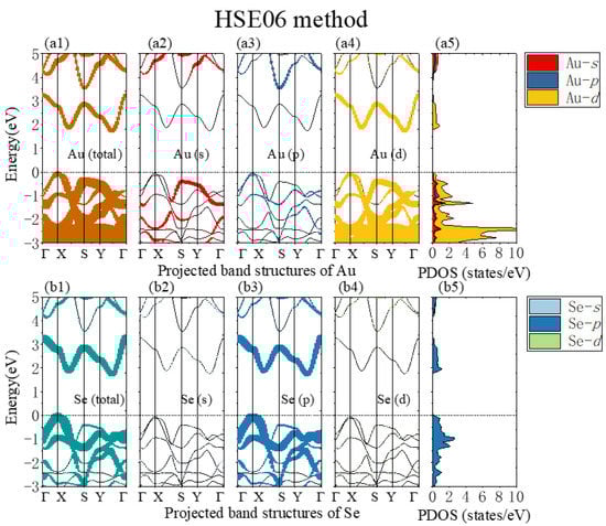 (a1,b1) The monolayer β-AuSe’s projected band structure of Au and Se using the HSE06 method. (a2–a4) The projected band structure of Au-s, Au-p, and Au-d electrons, respectively. (b2–b4) The projected band structure of Se-s, Se-p, and Se-d electrons, respectively. (a5,b5) The partial density of states of monolayer β-AuSe using the HSE06 method.