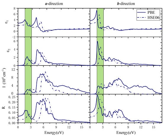 The calculated real part of the dielectric function (ε1), the imaginary part of the dielectric function (ε2) absorption coefficient (I), and reflection coefficient (R) in the a-direction and b-direction using the PBE method (solid line) and HSE06 method (dotted line). The area in the shaded area corresponds to the visible light region.