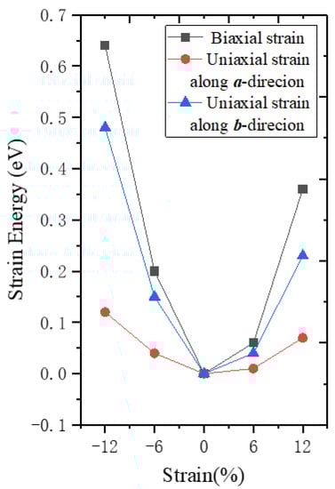 First, we calculated the strain energy when different strains were applied (Figure 6). The strain energy is the difference between the strained and strain-free monolayer β-AuSe. Under a certain strain value, the calculated strain energy was lowest when the a-directional uniaxial strain was applied, and highest when biaxial strain was exerted. For the same type of strain, the strain energy’s variation of tensile strain was smaller than that of the compressive strain. In other words, monolayer β-AuSe is most susceptible to deformation when it is subjected to a-directional uniaxial tensile strain.