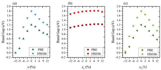 The changes in band gap when different strains were applied: (a) under the biaxial strain, (b) under the uniaxial strain along the a-direction, and (c) under uniaxial strain along the b-direction using the PBE and HSE06 methods.