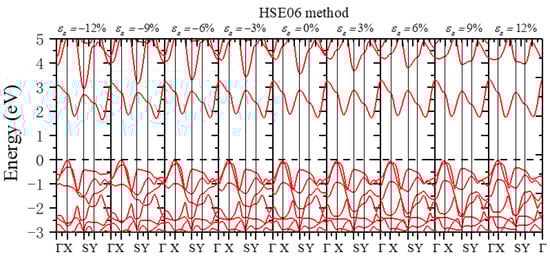 The band structure when different uniaxial strains along the a-direction were applied using the HSE06 method.