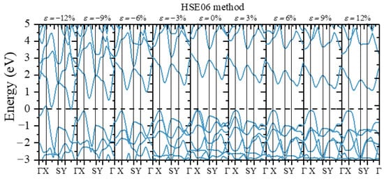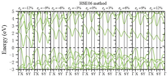 The band structure when different biaxial strains are applied using the HSE06 method.