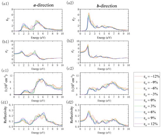 Figure 11 shows the changes in optical properties when imposing the uniaxial strain along the a-direction. Here, we focus on the absorption and reflection properties. In terms of absorption properties, in the a-direction and b-direction, the absorption edge revealed an inapparent redshift when exerting compressive strain. The absorption edge showed a more inconspicuous blueshift when applying tensile strain. The change in the absorption edge was negligible due to the inconspicuous change in the band gap when we applied the uniaxial strain along the a-direction. When shifting the strain from εa = −12% to εa = 12%, in the a-direction, the absorption coefficient in the visible light region increased, and the absorption range expanded. In the ultraviolet region, the maximum absorption peak revealed a blueshift, and its value remained unchanged. In the b-direction, the absorption coefficient in the visible light region decreased, while in the ultraviolet region, the maximum absorption peak revealed a blueshift, and its value decreased. Furthermore, the absorption range in the ultraviolet region narrowed. In terms of the reflection properties, when changing the strain from εa = −12% to εa = 12% in the a-direction, the static reflection coefficient and the reflection coefficient in the visible region increased, and the first reflection peak gradually shifted to the blue region. When the applied strain was compressive (from εa = 0% to εa = −12%), a new reflection peak arose in the 3–4 eV area, corresponding to the violet and near-ultraviolet region. With the increased compressive strain, this peak increased and shifted to red. In the deep ultraviolet region, the maximum reflection peak increased and shifted to red when the uniaxial strain changed from εa = 0% to εa = −12%, whereas it revealed a blueshift when the tensile strain changed from εa = 0% to εa = 12%. In the b-direction, when applying strain from εa = −12% to εa = 12%, the static reflection coefficient and reflection coefficient decreased where the photon energy was located in the VIS region; meanwhile, the first reflection peak gradually shifted to red. The absorption edge showed a more inapparent blueshift when tensile strain was applied. In addition, when the subjected compressive strain increased from εa = 0% to εa = −12%, a new reflection peak appeared in the UV region in the range of 5–6 eV and 7–8 eV. This peak increased and shifted to red with the enhancement of the compressive strain.