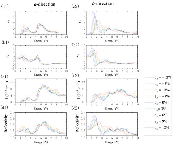 The changes in the imaginary part of the dielectric function (ε2), real part of the dielectric function (ε1), absorption coefficient (I), and reflection coefficient (R) when applying biaxial strain using the PBE method. Panels (a1–d1) and (a2–d2) show the results along the a- and b-directions, respectively.