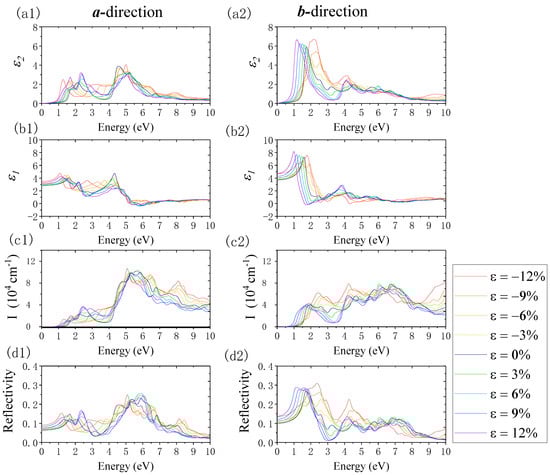 The variations in the imaginary part of the dielectric function (ε2), real part of the dielectric function (ε1), absorption coefficient (I), and reflection coefficient (R) when imposing the uniaxial strain along the a-direction using the PBE method. Panels (a1–d1) and (a2–d2) show the results along the a- and b-directions, respectively.
