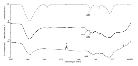 An infrared (IR) spectroscopic analysis of COOH−MWCNT and NH2−C2−MWCNT samples was carried out to confirm the functionalization process (Figure 3). The bands corresponding to C=C and C=O stretching vibrations for COOH−MWCNT appeared at 1636 and 1729 cm−1, respectively (Figure 3, middle curve). As a confirmation of the amide bond formation in the spectrum of NH2−C2−MWCNT (Figure 3, bottom curve), the carboxylic acid C=O stretching band at 1729 cm−1 was no longer present, and the stretching frequency of the amide C=O group was superimposed on the C=C stretching band at 1636 cm−1.