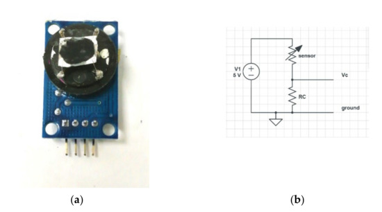 (a) MWCNT-based sensor and (b) the corresponding electrical circuit. The signal due to an increase in sensor resistance was detected on a pin Vc.