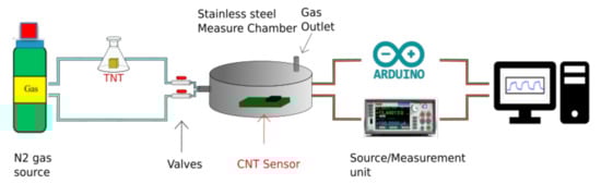 Carbon nanotubes (CNTs) are unique among nanoscale sensor platforms in their ability to detect the adsorption of as few as a single molecule of an analyte, as reported by Cognet, et al. [16]. CNTs may be covalently functionalized, becoming highly responsive to their physical and chemical environments. CNT-based chemiresistors displayed promising performance in explosive sensing [17]. To date, the majority of results in the literature demonstrated the capacity of the realized CNT-based sensors to reveal low concentrations of analyte molecules in a solution [18], but not directly in air, as highly desirable for preparing a compact device.