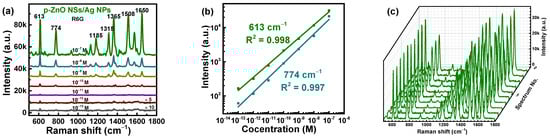 To investigate the quantitative detection ability, the linear relationship between the Raman intensities at 613 cm−1 or 774 cm−1 peaks with the R6G molecular concentrations was fitted and is shown in Figure 5b,e. The error bars represent the intensity distribution of the 613 cm−1 and 774 cm−1 peaks from 10 spots on one sample. All error values are small compared with the corresponding Raman intensities, which shows good reproducibility of different samples. The high determination coefficients (R2) of 0.995–0.998 for 613 cm−1 and 774 cm−1 peaks indicate the good linear relationship of Raman intensities with different R6G concentrations. Meanwhile, the covering of the R6G on the surface of SERS substrates can be analyzed with the fitting of adsorption Langmuir isotherm between Raman intensities and the logarithm of R6G concentrations. The relationships between Raman intensities at 613 cm−1 and 713 cm−1 peaks and the logarithm of R6G concentrations (10−7–10−13 M) were fitted according to the Langmuir isotherm model, which is shown in Figure S6. The R2 for the Langmuir isotherm fitting of Si/p-ZnO NSs/Ag NPs substrates are 0.984 and 0.951 for 613 cm−1 peaks and 774 cm−1. The R2 for the Langmuir isotherm fitting of Si/m-ZnO NSs/Ag NPs substrates are 0.959 and 0.955 for 613 cm−1 peaks and 774 cm−1. The non-linear Langmuir isotherm fitting may be more suitable for the actual measurement of wide range concentrations.