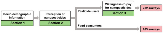 As illustrated in Figure 1, the questionnaire incorporated 12 questions that were divided into three sections; the complete questionnaire is presented in Appendix B. The first section included four socio-demographic questions (i.e., gender, age, education, and income), followed by five questions relevant to the perceptions of nanopesticides (i.e., familiarity with and attitude toward nanopesticides, labeling preference, and trust in governments and industries) in the second section. Respondents were then asked whether they planted crops needing pesticides. The food consumers (i.e., people from aquaculture and animal husbandry) would not need to purchase pesticides and quitted the survey. Only pesticide users (i.e., farmers) continued with the third-section questions, including the experience of applying pesticides and the WTP for nanopesticides (Figure 1).
