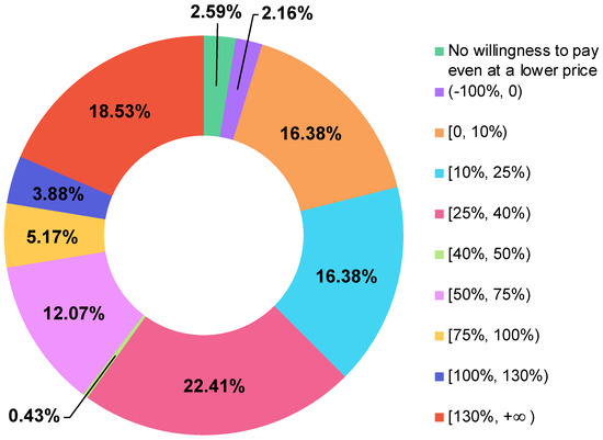 Not surprisingly, based on the above positive attitudes, most pesticide users (97.41%) were willing to spend money on nanopesticides. Only six pesticide users (2.59%) would not like to spend any money on nanopesticides, even if the price was lower than that of conventional pesticides (Table 1 and Figure 2). The high proportion of WTP for nanopesticides was much higher than that of WTP for other nano-enabled food products. For example, almost 50% of consumers refused to purchase foods (e.g., canola oil) with nano-packaging, nanodrop, and nano-sensor attributes [52]. The distinct proportions of WTP for different nanoproducts could result from various survey subjects; particularly, the more directly consumers were in contact with nanoproducts, the less likely they were willing to use nanoproducts [53]. Compared to nanopesticide users, fewer food consumers were willing to purchase foods engaged with nanotechnology. This high public purchase intention of nanopesticides could motivate academia, industries, and governments to advance the research and development of nanopesticides, rather than being impeded by worries and uncertainties about public rejection. Moreover, as illustrated in Figure 2, 2.16% of pesticide users would be willing to purchase nanopesticides only if the price was lower than that of conventional pesticides. The main price range that respondents were willing to pay for nanopesticides was 25–40% higher than that of conventional pesticides (Figure 2), guiding industries to improve market strategies and price nanopesticides more appropriately in the future.