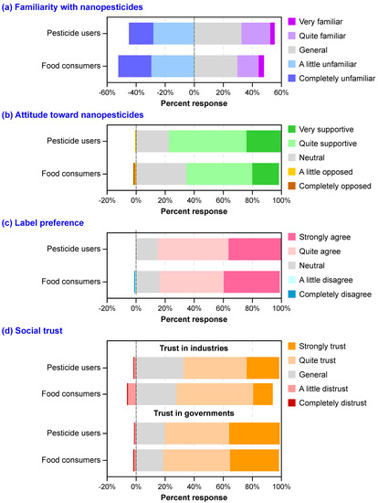 In general, nearly half of the survey participants were not familiar with nanopesticides (see light blue and dark boxes in Figure 3a), which was consistent with the results of various surveys that indicated the knowledge of food-relevant nanotechnologies in the general population was low [63]. Food consumers had a lower familiarity level with nanopesticides than pesticide users (Figure 3a). Nevertheless, few people in both groups opposed the future development of nanopesticides (Figure 3b). It implied that there are significant expectations regarding nanopesticides, which have the potential to be highly accepted in the market. In addition, most of the public had neutral positions or agreed that products should have labeling indications for nanocomponents (Figure 3c). The requirement for labeling indications should be incorporated into regulations by governments. Although the general public highly trusted governments, 6% of food consumers distrusted industries, and 28% of food consumers had general trust levels in industries (Figure 3d). Industries producing and selling nanopesticides need to put effort into communicating not only with pesticide users but also with food consumers to enhance general social trust. Otherwise, food consumers would not purchase the nanopesticide-engaged foods, which would further negatively influence pesticide users’ WTP for nanopesticides. It is, therefore, critical to understand current public perspectives on nanopesticides among both pesticide users and food consumers, thereby helping industries and governments assess the development trends of nanopesticides and make relevant strategies for production and regulations in the next stage.