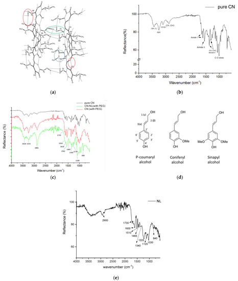 Structure and ATR infrared characterization of CN: (a) α-chitin molecular structure and hydrogen bonding. Colored circles represent the different hydrogen bonding processes inside the chitin crystal structure. Readapted from Pillai et al. [67], courtesy of Elsevier; (b) spectrum of pure CN; (c) spectra of pure CN (black), spray-dried CN containing PEG (red), and CN-NL (green); (d) main molecular fragments of lignin structure; (e) spectrum of nanolignin (NL).