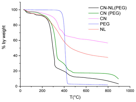 The results of the thermogravimetric analyses performed on pure CN, pure NL, PEG, spray-dried CN (with PEG), and spray-dried CN-NL (with PEG) powders are shown in Figure 3, while some characteristic data drawn from the recorded thermograms are listed in Table 3.