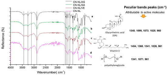 ATR infrared characterization of spray-dried CN-NL/M complexes: (a) CN-NL/AG; (b) CN-NL/GA; (c) CN-NL/VE; (d) CN-NL. The peculiar band peak values found in the spectra and attributable to VC, NI, and LU molecule are reported on the right.