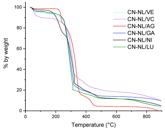A TGA analysis of the CN-NL/M complexes was carried out to study their thermal stability, as these complexes may require high-temperature processing, such as, e.g., melt blending [4,66] or extrusion coating [83], for their proper application. The thermograms of CN-NL/M powder samples containing the different active molecules are reported in Figure 8.