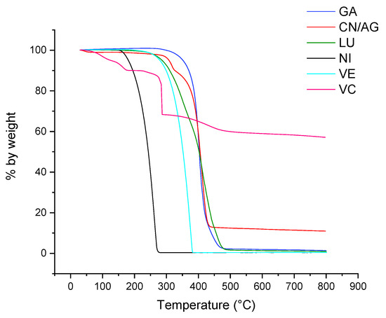 TGA thermograms of CN/Ag and of pure molecules: glycyrrhetinic acid (GA), vitamin E (VE), sodium ascorbyl phosphate (VC), nicotinamide (NI), and lutein (LU).