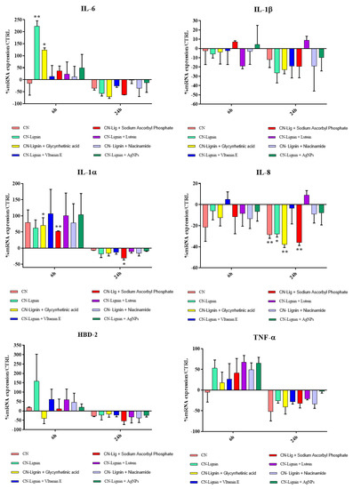 Cytokines are biological molecules that act as soluble mediators of natural immunity and the immune response [86]. Among the pro-inflammatory cytokines, we investigated a panel of interleukins (ILs) and factors: IL-1, according to its two forms, α and β, because it promotes local inflammation, increases the expression of adhesion molecules and induces the proliferation and differentiation of immune cells [87]; tumor necrosis factor-alpha (TNF-α), which is a powerful mediator in inflammation, since, with a cascade of events, it is able to recruit inflammatory cells and immunoglobulins, complements, and also acts on, platelet adhesiveness, favoring the formation of thrombus [88]; IL-6 mediates the autocrine, paracrine, and endocrine involved in inflammation [89]; IL-8, which recruits and activates polymorphonuclear leukocytes, is involved in basophil chemotaxis and angiogenesis [90]. The family of β-defensins is composed of small cationic peptides produced by epithelial cells, among others, and, inherently or in response to microorganisms or cytokines, it contributes to broad-spectrum innate immunity. In particular, human β-defensin-2 (hBD-2) is an antimicrobial peptide acting as an endogenous antibiotic in the defense against Gram-positive and Gram-negative bacteria, fungi, and the envelope of some viruses, and it is involved in the innate immune response because its release is induced by proinflammatory cytokines, endogenous stimuli, infections, or wounds [91,92,93,94]. The results of cytokine expression analysis showed that the substances were endowed with an immunomodulatory activity; in fact, they were able to upregulate the expression of IL-6, TNF-α, and IL-1α and to downregulate the expression of IL-8 after 6 h. In addition, all the substances, except for CN-NL/GA, showed indirect antimicrobial activity, as they induced the expression of HBD-2 by keratinocytes after 6 h (Figure 10). All the cytokines that resulted were downregulated after 24 h, suggesting that the pro-inflammatory effect (fundamental to initiate the healing process) was actually modulated in a short time, bringing the cells back to or below their basal expression condition.