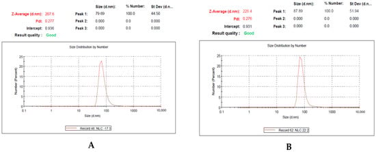 Data of particle-size distribution and zeta potential of the prepared nanoemulsion; (A): Nanoemulsion without drug; (B): Methotrexate-loaded nanoemulsion.