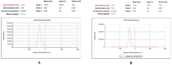Zeta potential is an indicator of the stability of nanoemulsion. Determination of the zeta potential gave a value of −35.9 ± 0.73 mV for the optimized nanoemulsion loaded with methotrexate, while the zeta potential for nanoemulsion without drug was −33.9 ± 1.03 mV (Figure 3). The values of the zeta potential confirmed that the prepared nanoemulsion was negatively charged droplets with the capacity of higher lymphatic uptake and longer retention time. It measures the electrical repulsion force between the particles. It has been documented a higher zeta potential (>−30 mV) is advantageous to vesicle’s physical stability as it avoids accumulation between vesicles owing to electrostatic repulsion resulting in a stable emulsion. The low zeta potential of emulsions leads to coagulation or flocculation of vesicles, resulting in poor physical stability [23,24,25]. According to these findings, we concluded that the selected composition of drug, oil, and surfactant makes the nanoemulsion electrically stable.