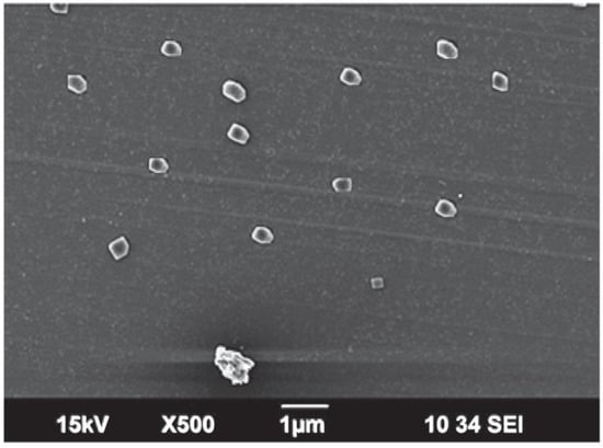 The SEM (scanning electron microscope) photograph of the methotrexate-loaded nanoemulsion shows that the particles have almost spherical morphology, are uniform and monodispersed (Figure 4). A nanoemulsion is a kinetically stable, dispersed system with particles of small droplet size. The spherical shapes indicate the stability of the system without aggregation and gravitational separation. This stability can be attributed to the presence of surface-active agents. The study conducted by Zhou et al. shows that the spherical nanoemulsion can rapidly penetrate the cell [26]. The results from SEM are consistent with the result of particle-size characterization.