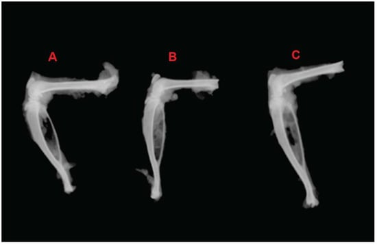 Radiographic analysis of the knees with the administration of the formulation. (A): FCA-induced arthritis, control group; (B): Methotrexate-loaded nanoemulsion; (C): marketed drug solution.