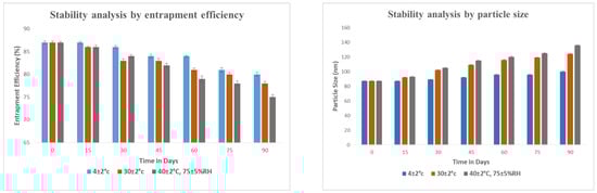 Graphical representation of stability study of methotrexate-loaded nanoemulsion according to particle size and entrapment efficiency.