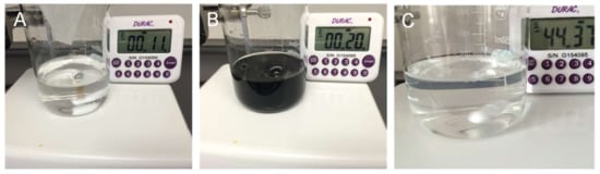Photographs of the experimental process of Bi(NO3)3 reduction with NH3BH3 without rGO support.(A) Bi(NO3)3 solution in the ethylene glycol, (B) NH3BH3 added in the solution, (C) Continuous stirring for approximately 45 min.