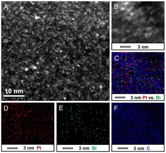 HRTEM images, HAADF-STEM, and EDS element mapping images of ultra-small Pt/Bi/rGO. (A) HRTEM images of ultra-small Pt/Bi/rGO, (B) HAADF-STEM-EDS mapping image, (C) overlapped image, and (D–F) HAADF-STEM-EDS elemental mapping images for Pt, Bi, and C, respectively, taken for the area in (B).