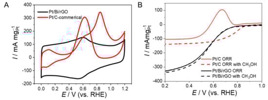 (A) CV curves measured in 0.5 mol/L H2SO4 and 0.5 mol/L methanol aqueous solution for the Pt/C and ultra-small Pt/Bi/rGO catalysts, respectively. (B) Comparison of oxygen reduction properties in 0.5 mol/L H2SO4 (dashed line) and 0.5 mol/L H2SO4 + 0.5 mol/L methanol aqueous solution (solid line). All current densities are normalized against the mass of metallic Pt loaded onto the electrodes.