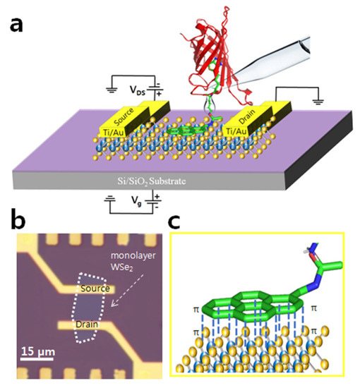 For a better health monitoring and curing system, the precise and prompt detection of target analytes has gained importance. As in the COVID-19 situation, the rapid screening of COVID-19 patients by sensitively detecting the spike protein can prevent the spread of the virus [1,2]. Hence, there is high demand for a point-of-care (POC)-based health monitoring system which can offer an ideal platform with low-cost, reliable, and easy-to-use diagnostics of key biomarkers needed for the early screening of pandemics and other health concerns. Most established methods for protein-based molecular diagnostic tests, such as immunoassays, are time-consuming and costly to use, since they require many reagents and skilled personnel. Due to this, their implementation as a POC-based system has been limited and has become partially ineffective for service in a pandemic situation [3]. Hence, substrate-based detection systems are needed, as they provide the lab-on-a-chip platform. However, the currently established substrate-based protein detection systems are facing challenges regarding uncontrolled orientation, stabilization of target protein with good surface density, and selectivity [4,5,6]. In short, a substrate based POC device with accurate, real-time, and rapid response against target protein is urgently needed. Researchers have made tremendous efforts to develop highly sensitive substrates by using various 2D materials as channels, such as transition metal dichalcogenide-based field-effect transistors (TMDC-FET). Several practical devices such as field-effect transistors (FETs), solar cells, logic circuits, memories, diodes, photo detectors, etc. have been prepared based on single- or van der Waals stack of two same or different TMDs for effective operations and controlled functionalities [7,8,9]. These materials are preferred on simple graphene or graphene oxide due to their high sensitivity, inherent bandgap, and compatibility with planner surfaces. Among the atomically layered TMDCs, molybdenum disulfide (MoS2) and tungsten diselenide (WSe2) have been widely studied as attractive materials for biosensing applications [10,11,12,13]. Compared to pure graphene-based FETs, TMDS materials have a modest bandgap, which reduces leakage current significantly during device measurements, resulting in better sensitivity [14,15]. However, the WSe2-based FET biosensor exhibited better linear regime sensitivity than MoS2-based FETs for the detection of tumor necrosis factor-alpha detection [16]. This better performance is attributed to the ambipolar transfer characteristics of WSe2 FET and relatively better carrier mobility [17,18]. Most recently, the WSe2-based FET device has been utilized for early stage detection of prostate cancer protein [19].