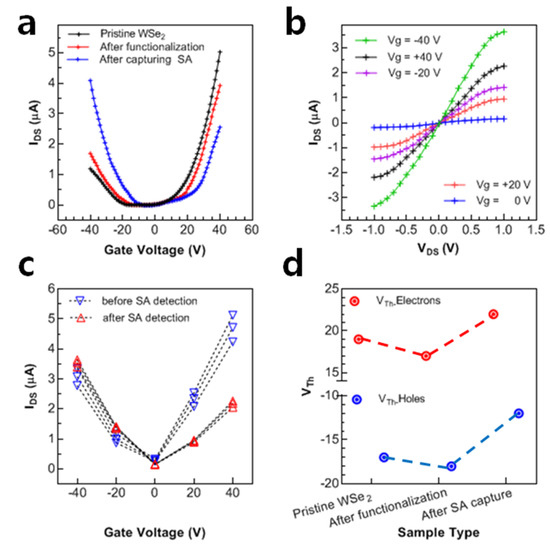 The monolayer WSe2 FET device is utilized for the detection of the selected protein (SA) in the solution phase. The in-plane hexagonal nature of the WSe2 sheets provides an excellent plate form for the Pyrene ring, which is easily attached over its surface via π-π bonding, as shown in Figure 1c. The VDS is adjusted to a fixed value of 0.5 V before device functionalization. For the functionalization of the WSe2 FET device, a 2.5 µL of supporter solution was drop cast on the channel by using a micropipette. Figure 4a exhibits the transfer curves of the device after its functionalization (red) and its comparison with the pristine state (black). As the Pyrene rings from the supporter molecules attached to the device, it showed a minor shift in its threshold voltages, but a large shift in threshold voltage is observed after attaching the protein molecules, owing to the large size of the SA molecule (~5 nm). The blue line in Figure 4a represents the shifting of the transfer curve after the SA binding. This shift in threshold is possibly attributed to hole doping. The maximum electrons are occupied by the biomolecules (Pyrene + protein) and it upsurges the current due to the holes [16,56,57]. After detection of the protein molecules, the I–V curves at various gate voltages are illustrated in Figure 4b. These I–V curves also show that the majority of charge carriers are holes after the detection of the biomolecules. As the Pyrene and protein attach to the WSe2 sheet, it changes its nature from more n-type to more p-type. Figure 4c shows the current level of the gate voltage before and after the detection of SA. The shift in threshold voltage is also demonstrated in Figure 4d for the pristine, functionalized, and SA capturing WSe2 device. This threshold shift clearly illustrates that the current of holes is increased after SA capturing.