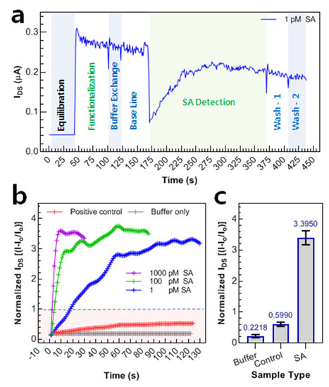 Finally, to evaluate the robustness of prepared WSe2 FET, real-time testing was performed using a KeysightB1500-A semiconductor parameter analyzer. The input voltage was fixed to a small value of 0.2 V, and the output current was recorded as a function of time. As a first step, the equilibration was carried out to create an initial baseline and ~0.042 µA of the current was recorded. For the device functionalization, the supporter molecule containing solution (1 nM) was drop cast. As the Pyrene rings of the supporter molecule are attached to the WSe2 sheet, a large current is observed because of the charge transfer from the Pyrene ring to the WSe2 sheet. As functionalization occurred, the current was saturated (0.253 µA) within a min and there was no more increase in its value. This was marked as the functionalization of the WSe2 FET devices. Our receptor functionalized the channel surface in a highly self-oriented manner due to the large span of ring components attached to its N-terminal. After the current was leveled-off, the device was washed with solution buffer to wash away the unbounded supporter molecules. After a little fluctuation, it can be seen that the level of current almost remained the same, i.e., 0.261 µA. To ensure a proper wash and create the baseline, a second wash was applied and noted the current, i.e., remained the same (0.257 µA). The level of current remained the same before and after washing, owing to the optimized concentration of supporter solution (1 nM). Finally, the solution containing 1 pM SA was drop cast, and the level of current was noted. It can be seen that the current reached its equilibrium position within 2 min. It is believed that the SA binds to biotin due to their strong non-covalent interaction between the 10 amino acidic resides, explained in [57]. Owing to the non-covalent interaction, the level of current was decreased and leveled-off to a level of 0.208 µA. Finally, to ensure that the signal readout was due to the actual binding of SA rather than just being on the surface, we double washed the device with the solution buffer and it can be seen that the level of current remained the same, as shown in Figure 5a. The SA concentration was varied from 1000 pM to its 10-dilution fold and the current was noted. To eliminate the device-to-device error, the normalized value of the current was calculated and plotted in Figure 5b. In order to test the selectivity of our device, a simple solution buffer was used as a negative control and BSA (66.4 kDa), being a similar molecular weight to our target protein SA (66 kDa), was used as a positive control. After its measurement, a minute current response can be observed, which is due to the unwanted stacking of BSA on the channel via physical forces. After considering the level of the response given by serum protein, we calculated the standard deviation and marked the confidence level of the device, the red zone in Figure 5b. The difference in the level of response plotted for an average of three measurements for each sample can be seen in Figure 5c, showing the consistency of the results.