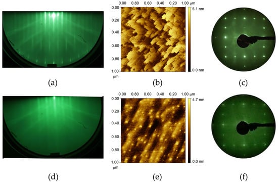 (a) RHEED pattern, (b) STM image, and (c) LEED pattern of MBE as-grown 4 nm–thick Si0.5Ge0.5 on epi Ge(001)-2×1, and (d) RHEED pattern, (e) STM image, and (f) LEED pattern of MBE as-grown 1 nm–thick Si0.1Ge0.9 on epi Si(001)-2–1. STM images are 1 µm × 1 µm in size. The electron beam energy of the LEED images was 40 eV.
