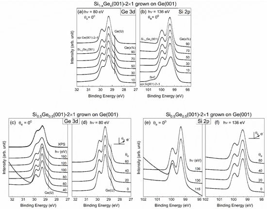 Wide scans were taken of the as-grown Si1−xGex(001)-2×1 samples featuring various Ge contents with 136 eV photon energy (hν) and simultaneously covering both the Si 2p and Ge 3d core-level spectra under normal emissions at room temperature. These scans showed the increased strength of the Ge 3d line with an increase in x (data not shown). The details for the Ge 3d and Si 2p core-level spectra with a good signal-to-noise ratio are presented in Figure 3, with x ranging from 10% to 90% in panels Figure 3a,b, respectively. The single elements of epi Ge(001)-2×1 (x = 1) and epi Si grown on epi Ge(001)-2×1 (x = 0) are also included in the plots as references. The photon energies for the Ge 3d and Si 2p core-level spectra were 80 and 136 eV, respectively. We selected a sample with 50% Ge content as the representative sample upon excitation with various photon energies and emission angles. The acquired Ge 3d core-level spectra are shown in Figure 3a,c,d, and the Si 2p core-level spectra are provided in Figure 3b,e,f. First, we discuss the behaviors of the Ge 3d core-level spectra. Notably, the data were collected after the MBE-grown SiGe(001)-2×1 sample had been docked in the portable UHV module for 12 h. The absence of an oxidation state in both the Si and Ge core-level spectra suggested that the SiGe(001) surface was surprisingly stable in a vacuum, as Si(001)-2×1 surfaces are readily oxidized under similar UHV conditions. Stable surfaces were also found on the MBE-grown epi Ge(001)-2×1 [18,25,26] and (In)GaAs(001) surfaces [23,27,28,29,30]. The binding energies of the bulk Si 2p and Ge 3d core-levels were located at 99.31 and 29.26 eV, respectively. The energy position of the Ge 3d state was found to coincide with that in epi Ge(001)-2×1 [18,25,26], although the energy position of the Si 2p state appeared to be noticeably lower than the nominal value of 99.8 eV in crystalline Si(001)-2×1 [31].