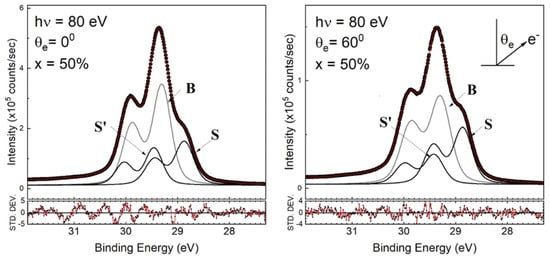 Before the final-state effect validated the interpretation of the Ge 3d (Si 2p) core-level spectrum, researchers often studied the final-state effect based on the initial-state effect. This practice was naturally applied to the Ge 3d and Si 2p core-level spectra acquired for SiGe(001), as reported in Ref. [32]. As a result, this previous study claimed that the topmost SiGe(001) surface was terminated with buckled Ge–Ge dimers and that the subsurface layer was occupied by Si. The initial-state effect was initiated to assign the features with lower binding energy than that of the bulk line. This lower energy corresponds to the up-dimer atoms (S), whereas the down-dimer counterparts (S’) have greater binding energy. The researchers in Ref. [32] used a deconvolution method to obtain a conclusion without further employing fitting to explicitly present the dimerized components. We tentatively made a similar assumption to process our Ge 3d core-level spectra data, which featured a higher-energy resolution than the data in Ref. [20]. The fitted results for x = 50% are shown in Figure 4. The Ge 3d line is represented by three components associated with bulk Ge(B), S, and S’ components. Upon fixing the shifted values of components S and S’, we found that the S component increased in intensity, but the S’ component instead dropped in strength under off-normal emissions. However, for components S and S’ in both angled spectra, the fitted results gave an unrealistic areal intensity ratio far from the expected value, which is one. This suggested the need to examine the validity of interpreting the Ge 3d core-level spectra with the initial-state effect. Notably, oxygen-induced features generally appear in high-energy positions. If the Ge 3d core-level spectrum is not properly understood, confusion might arise, thereby making it difficult to truly understand atom-to-atom interactions at the interface.