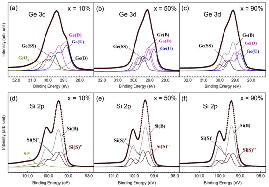 Fitting for the Ge 3d (a–c) and Si 2p (d–f) core-level spectra.