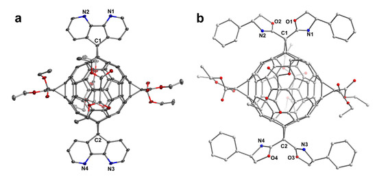 (a) Single-crystal structure of fullerene linker L1 with 15% thermal ellipsoids, and (b) the molecular structure of L2. Hydrogen atoms were omitted for clarity.