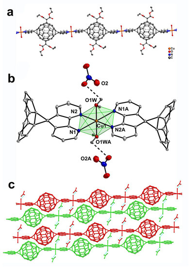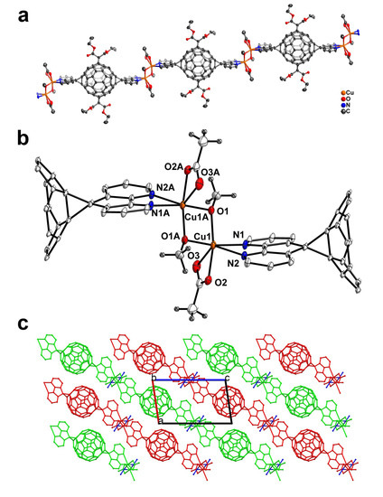 The reaction of L1 and Cu(OAc)2·H2O produced green crystals of compound 4 with the composition of CuL1(OAc)(CH3O). The space group of 4 was determined to be P-1, which is the same as compound 3. Its asymmetric unit contains half of molecule L1, one Cu ion, one CH3COO− anion and one CH3O− anion. Unexpectedly, the polymeric structure of compound 4 is a 1D stair-like chain (Figure 5a) instead of a 1D straight line as shown in compound 3. The fullerene units in 4 are unprecedentedly connected by a bimetallic Cu(II) center (Figure 5b) instead of a single Cu(II) as presented in crystal 3. Further crystallographic analysis reveals that Cu1 and Cu1A possess the identical coordination environments of two nitrogen atoms from one diazafluorene unit (Cu–N distances of 2.013(3) Å and 2.630(2) Å), two oxygen atoms from one acetate anion, and two bridging oxygen from CH3O− anions generated from methanol (a solvent for crystallization). The coordinated Cu ions exhibit an η2 coordination mode to the acetate anions. The distance of Cu1-Cu1A is 2.992(9) Å, longer than the van der Waals contact (2.8 Å) for Cu-Cu [31,32], suggesting that no metal-metal bond is formed between the two copper ions. To the best of our knowledge, compound 4 represents the first example of a dinuclear Cu(II)-linked fullerene coordination polymer. The packing mode of 4 is shown in Figure 5c.