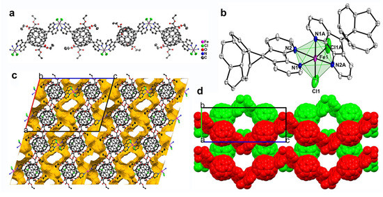 As a comparison, trivalent FeCl3·6H2O was adopted to assemble with L1 as well. The reaction of FeCl3·6H2O and L1 generated red crystals of Fe(L1)Cl2(FeCl4) (6). As evidenced by the single-crystal structural analysis, compound 6 has the I2/a space group, the same as that of compound 5. The asymmetric unit consists of half of the L1 molecule, half of Fe(III) ion, one Cl− anion and half of [FeCl4]− counter anion. Figure 7a shows that a 1D chain structure is formed, which is different from the zigzag shape in compound 5. The packing mode as displayed in Figure 7c,d is also different from that of compound 5. The central Fe(III) ion is hexa-coordinated by two chlorine atoms with a Fe-Cl distance of 2.333(5) Å, and four nitrogen atoms from two diazafluorene units with the Fe-N distances of 2.238(6) Å and 2.242(7) Å, which is similar to the coordination of the central Fe1(II) ion in compound 5. The sum of the four angles around the central Fe(III) ion is 359.97° (N1A-Fe1-Cl1A, 96.93(2)°; N1A-Fe1-N2, 93.07(2)°; N2-Fe1-N1, 80.03(2)°; N1-Fe1-Cl1A, 89.94(2)°), and the angle of Cl1-Fe1-N2A is 169.97(2)°, forming a deformed octahedron coordination geometry as observed in 5. However, the presence of Fe3+ makes a unit of [FeCl4]− appear as a counter anion in the crystal to stabilize compound 6 (Figure 7b). All the [FeCl4]− units occupy the spaces between the 1D chains (Figure 7d), and the central Fe2(III) ion is bound by four chlorine atoms with Fe-Cl distances in the range of 2.114(4)-2.189(4) Å, in agreement with the reported values for Fe-Cl bonds [33].