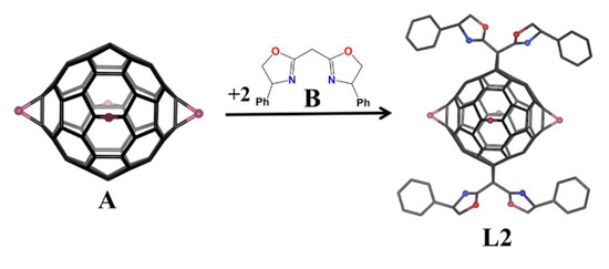 The synthesis of L2 is shown in Scheme 1. Tetrakis-[di(ethoxycarbonyl)methao]-C60 (A) [23] and 2,2′-Methylenebis[(4S)-4-phenyl-2-oxazoline] (B) were synthesized according to the previous reports [26]. First, 67 mg (0.444 mmol) 1,8 diazabicyclo[5.4.0]undec-7-ene (DBU) was added to a CH2Cl2 solution of 100.0 mg (0.073 mmol) A, 73.5 mg (0.222 mmol) CBr4 and 67.9 mg (0.222 mmol) B. The reaction mixture was stirred at room temperature for 12 h. Then, the solvent was removed under reduced pressure and the product was purified by Prep-TLC to get light yellow solid L2 (35 mg, 28% yield). Data for L2: 1H NMR (600 MHz, CDCl3, TMS): δ = 7.34 (m, 20H), 5.44 (t, 4H, J = 9 Hz), 4.80 (t, 4H, J = 9.6 Hz), 4.37 (dd, 8H, J12 = 7.2 Hz, J13 = 14.4 Hz), 4.31 (m, 12H), 1.34 (t, 12H, J = 7.2 Hz), 1.31 ppm (t, 12H, J = 7.2 Hz). 13C NMR (150 MHz, CDCl3): δ = 164.0, 163.6, 161.1, 146.2, 145.9, 145.8, 145.7, 142.2, 141.8, 141.6, 141.2, 141.1, 141.0, 128.7, 127.6, 127.1, 75.6, 70.3, 69.6, 69.2, 69.1, 62.9, 62.8, 45.6, 45.4, 34.7, 14.2, 14.1 ppm. NMR spectra of L2 can be found in the Supplementary Information (Figures S1 and S2). MS calcd. C126H72O20N4, [M+H]+ = 1961.47; found 1961.76.