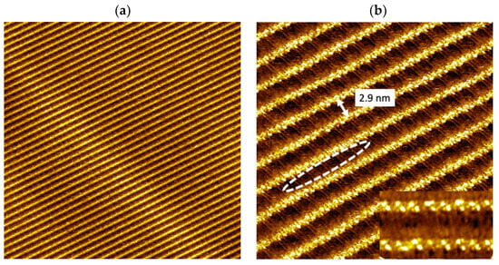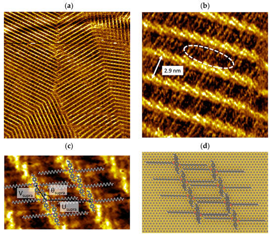 The repetitive unit of 2D islands consists of parallel pairs of disjoined bright rods (Figure 2b). These repetitive units form a compact periodic network constituted by bright lines, which are separated by darker stripes. The periodicity between the bright lines is 2.9 ± 0.2 nm. In each darker strip, some features (marked by a white dashed ellipse in Figure 2b) are visible and they are aligned along the HOPG (100) orientation at both sides of the bright rods.