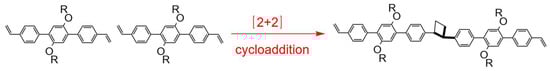 Scheme of hypothetic polymerization of C=C bonds between two consecutive vinyl-OC18 molecules by a concerted [2+2] cycloadditions leading to a cyclobutane as a connecting node.