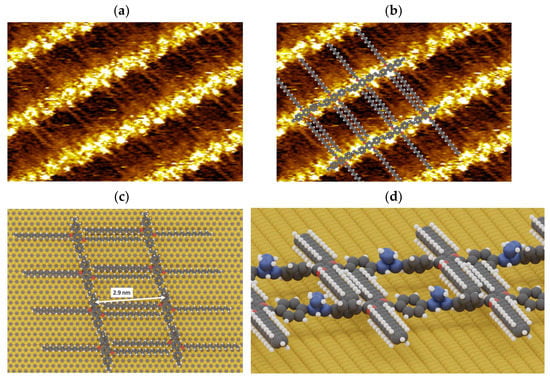 (a) STM image (Vs = −0.5V, It = pA, 10 nm × 5 nm) of vinyl-OC18 polymerized network. (b) STM image (Vs = −0.5V, It = pA, 10 nm × 5 nm) of vinyl-OC18 polymerized network with corresponding superimposed model. (c) Model of polymerized network, (d) side-view of the polymerized network.